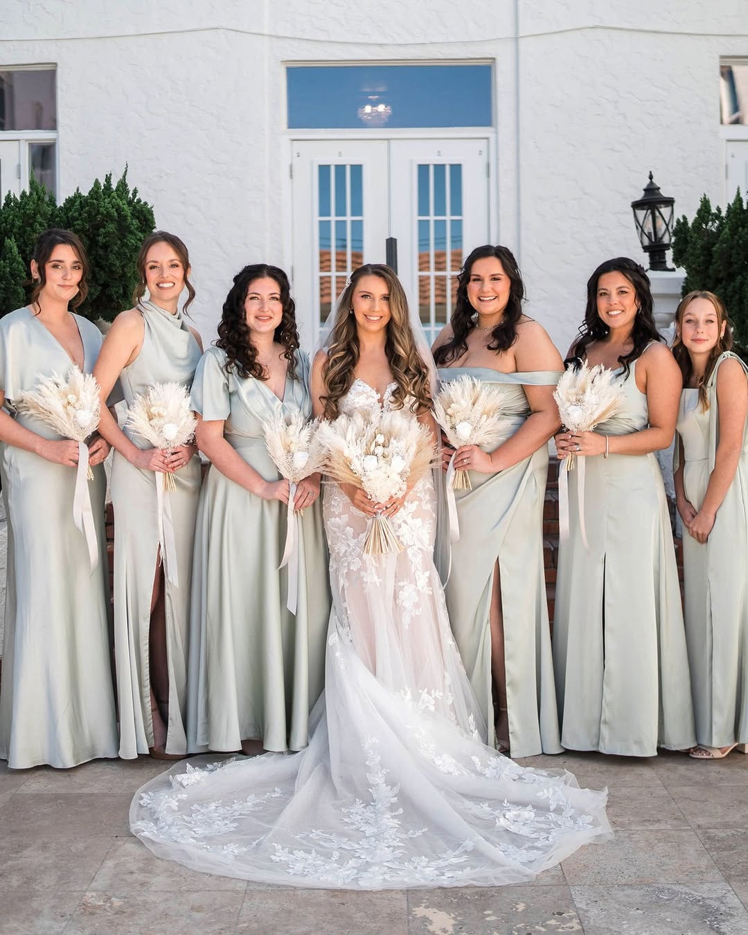 Small styling choices elevate the dress and tie the bridal party together.