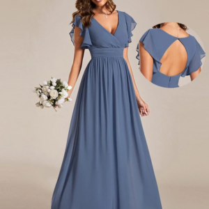 Back Cutout A-Line Pleated Ruffles Sleeve Chiffon Dress (ES01819)