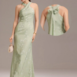 - Cross-halter necklines that flatter shoulders and elongate the form