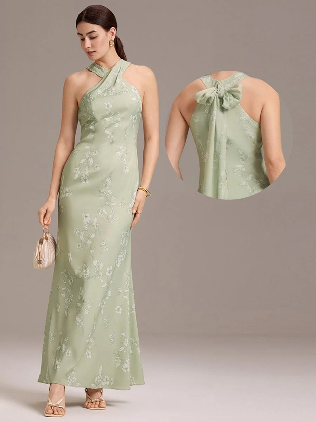 Elegant Cross Halter Neck Floral Satin Dress(MS02432)